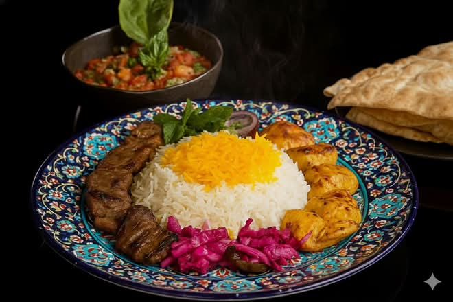 A generous spread featuring 3 skewers of chargrilled koobideh, 1 sizzling beef chenjeh, and 1 golden chicken breast, served with fragrant saffron rice and your choice of 3 sides. Perfect for an intimate dinner.